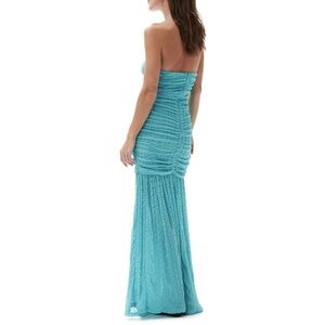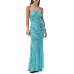 NEW GANNI Ruched Stretch Lace Halter Maxi Dress in Blue Curacao Sz. 34 (XS)