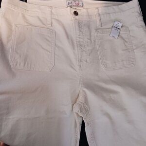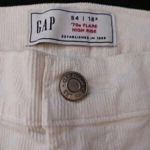 Keywords: GAP, Size 18, High Rise Corduroy, '70s Flare Pants, Ivory Beige, GAP brand, Beige pants, Flare leg style, Patch pockets, High rise, Corduroy material, Classic '70s fashion, Beige corduroy pants, Cotton pants, Cream Corduroy Pants, Neutral Pants