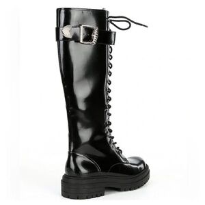 From GB, the Sky Scraper Lace-Up Lug Sole Platform Tall Boots feature: