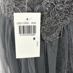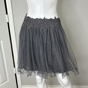This is a new gray tulle lace mini skirt by Gianni Bini, sized small/ 9. It has a feminine floral lace pattern with an airy layer of tulle and a fairy goth grunge theme.