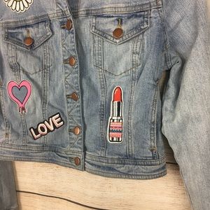 NEW GIANNI BINI Girls Faded Blue Denim Unicorn Peace Lip Patch Jacket Coat Sz M
