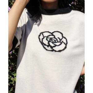 Discover the Rosa Short Sleeve Sweater by GIGI MODA, a minimalist staple for your spring wardrobe. Crafted in Italy, this beige sweater features a striking rose print on its front and a mockneck design. It's made from a viscose blend of 53% Viscose, 42% PBT, and 5% Polyester and comes in a convenient one-size pull-on style. Care instructions: Hand wash only. The model is 5'7" tall.