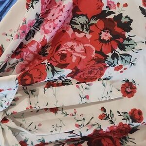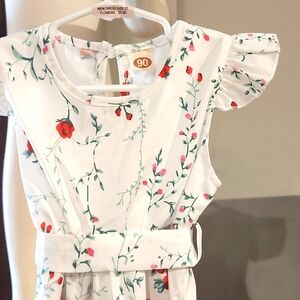 NEW GIRLS DRESS RUFFLE ON SLEEVELESS SLEEVE. SIZE 2T. WHITE BACKGROUND WITH RED ROSES ROUND COLLAR BELT FROM FRONT TO BACK THEN TIED INTO A BOW THE BACK HAS 1 PEARL BUTTON HOOKED BY A SMALL BOW TIE.