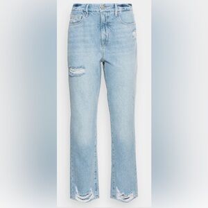 A powdery-blue pair of straight leg jeans is enhanced with distressing at the thigh, hip and cuffs for a tried-and-true '90s look.