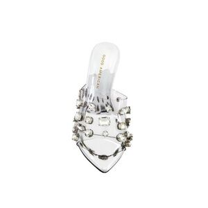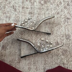 Elevate your style with these stunning silver heels from Good American, featuring a modern geometric heel and a sleek, angular design. The shoes boast a glamorous silver finish, perfect for making a statement at any event. With their unique architectural heel, these heels are both fashionable and comfortable, ensuring you stand out in any crowd.