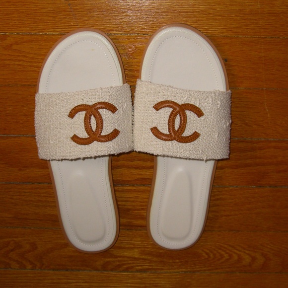 Beautiful white cloth slides with faux leather design. There is no size tag on the shoes. Slides measure 10 inches from toe to heel, which is equivalent to EU40 or US 9.5 Brand new. No box.