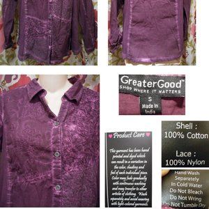 NEW! GREATER GOOD Purple Cotton Embroidered LS Button-Down Shirt! S