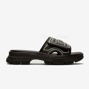 NEW GUCCI Aguru Black Leather & Rubber Logo Sandals Slides G 11 / US 11.5