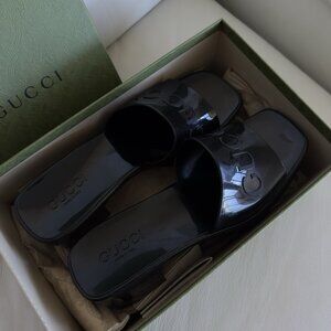 NEW GUCCI BLACK Rubber Logo Platform Block Heel Slide Sandals Size 10 US 40 EU