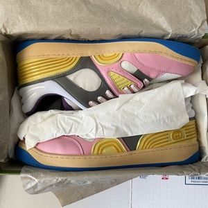 NEW GUCCI Basket Panelled Low-Top Sneaker in Pastel Pink Yellow White Demetra 40