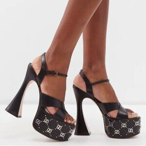 Brand New With Box GUCCI Janaya Interlocking GG Studs Black Leather Platform Sandals