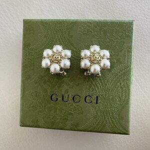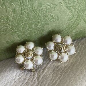 NEW GUCCI Pearl Earrings Interlocking Gold Clip On Type Logo Engraved 2cm x 2cm