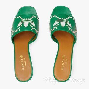 New In Box Authentic GUCCI x ADIDAS GG Trefoil Logo Green Leather Heel Sandals
