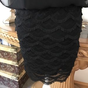This is a one piece (but looks like 2). The Top has a sheer fabric over a satin fabric. Bottom has a pencil style fit, with fringe scalloped detail, and belt. Hard to photograph, Pictures don’t do it justice. refer to pics. Questions welcomed. New w/o tags. Size 2.