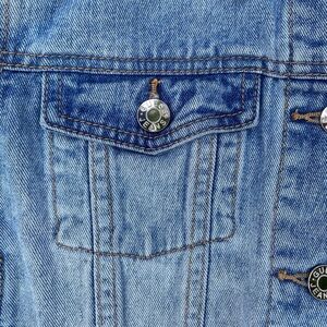 A light-wash denim jacket is a closet must-have. This one gets a retro-cool update with multicolor racer-stripes on the long sleeves, with a pointed collar, welt pockets and button-flap front pockets. Front button closures.
