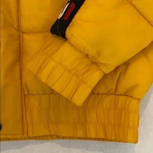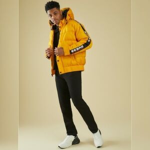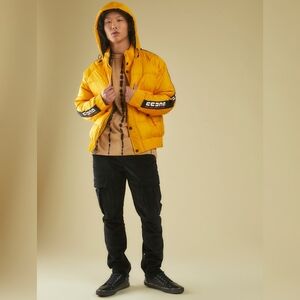 A statement puffer jacket for the cooler seasons. Featuring a built-in hood with drawcords, classic stand-up collar in a puffer-style cut with GUESS ski-themed tape along each sleeve. Elastic cuffing and hem. Front zip and snap closures.