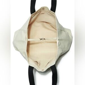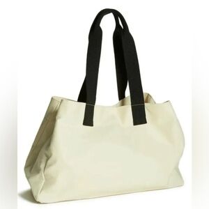 Get beach-ready with the help of this canvas tote bag featuring webbed shoulder straps and logo text across the front.