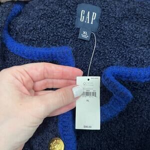 NEW Gap Navy Blue Boucle Sweater Size XL. New with tags NWT. Dark navy blue with large gold buttons. Front pockets. Great workwear! Thick, warm material.