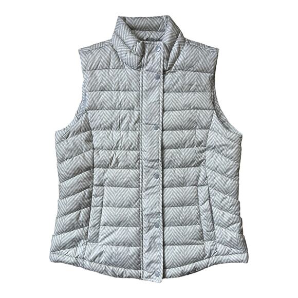 NEW Gap Outlet Cream and Gray Herringbone Puffer Vest. Zipper and Snaps. 100% Polyester. Rounded Hem. Women's Size Medium.