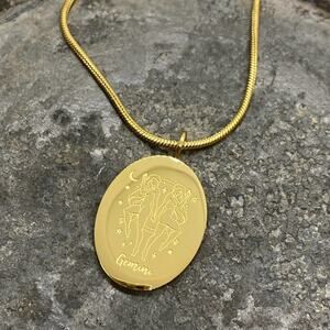 Features: gold plated stainless steel pendant with etched zodiac goddess. 18”L 2” extender