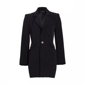 The Generation Love Jeanne Blazer Dress is a fitted mini style with strong shoulders and a single goldtone basket weave button, showcasing a chic and sophisticated style.