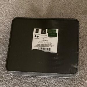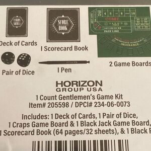 Still sealed in original wrapping. Contains one deck of cards, one scoreboard book (64 pages/32sheets), two game boards (one craps game board and one black jack game board), one pair of dice, and a pen.