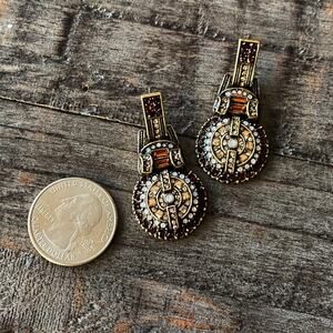 Features: gold plated brass, antique finish, bronze tone rhinestones, post backs