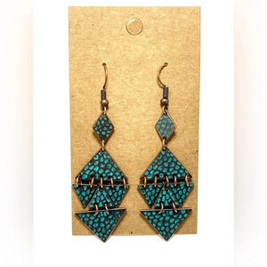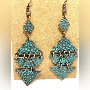 Gorgeous boho geometric earrings in antiqued copper with a patina finish. Each section is connected to the other with a jump ring so they actually move when you wear them. Gorgeous.