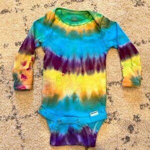 This Gerber Tie Dye Long Sleeve Mitten-Cuff Cotton Onesie Bodysuit has never been worn and in excellent condition. Hand dyed with love in Connecticut by me.