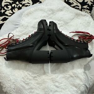 NEW Woman’s Gianni Bini Ryedderr Leopard & Red Lace Up Block Heel Black Combat Boots Side Zipper, Size 10M. New, Never worn, stickers still on soles. Smoke & pet free home.
