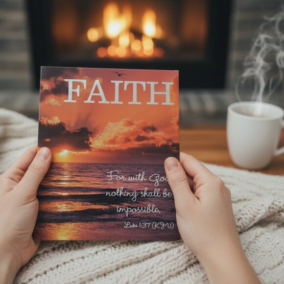 - hardbound cover in sunset prints with Luke 1:37 bible verse and FAITH text in front