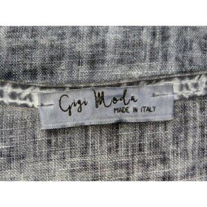 Description: This is a genuine Gigi Moda 100% Linen Tunic Blouse. No rips, tears, marks, stains, flaws or defects. NO damages. The blouse features round neckline, short sleeves, asymmetric hem detail with sheer hem, silver metallic threading detail, pullover style, breathable 100% natural linen fabric, Made in Italy. Retail $105