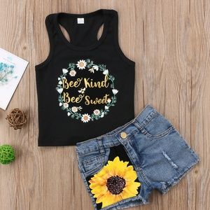 Let her rock the sunshine season with this girl's Bee Kind Bee Sweet Short Summer Outfit! The tank is crafted from cotton comfort, and the shorts are made of denim durability.