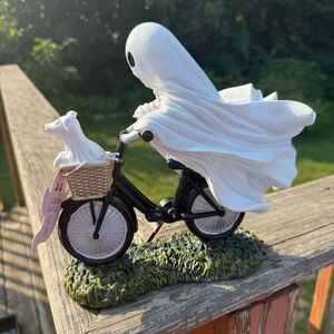 Add a whimsical touch to your home with this charming ghostly bicycle figurine. Featuring a ghost in white riding a bike with a cute dog in the basket, it's perfect for Halloween or year-round decor.