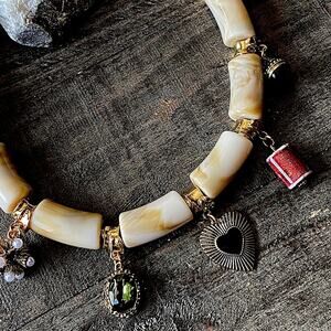 Features: gold plated stainless steel, cream marble resin beads, perfect for fall