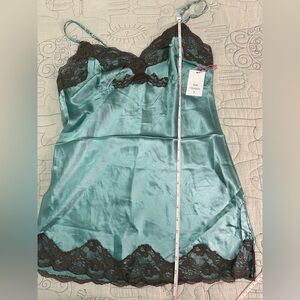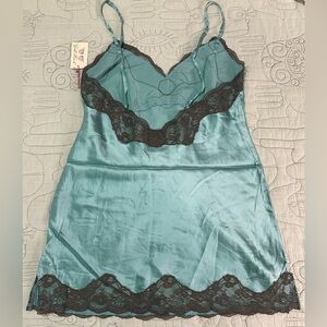 NEW Gold Hawk Two Tone V-Back Lace Chemise Silk Cami M Blue Grotto Brown Lace