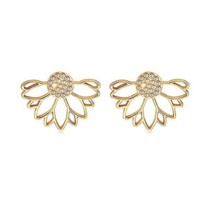These earrings are 3 earrings in 1! They feature a round crystal stud and a lotus flower that cuffs in back. Can be worn as shown; just as a pair of studs; or with your own pair of studs and the gold lotus flower cuffed in back. Extra set of earring backs included.