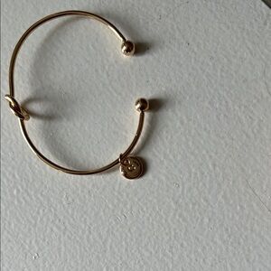This gold bracelet showcases a minimalist design with a delicate knot detail at its center. Its open-ended, wire-like construction offers a modern and polished look, perfect for any occasion.