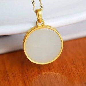 It has synthetic white jade as a center, surrounded by gold tone metal.