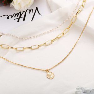 NEW Gold Triple Layer Coin Chain Pearl Necklace