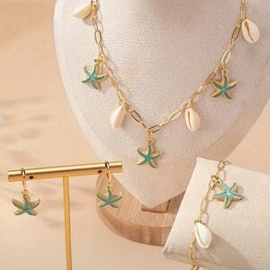 This elegant jewelry set features a stunning combination of gold and blue starfish designs. Perfect for adding a touch of ocean-inspired charm to any outfit.