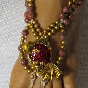 One-of-a-kind handmade barefoot sandals have large metal and enamel goldfish centerpieces and are beaded with natural red jasper gemstone and golden acrylic accent beads. These sandals are made with polished hemp. They have braided toe loops and ankle ties for added durability. They have 14" long back ties that can be wrapped around the ankle. One size fits most adults.