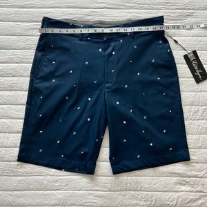 Walter Hagen flat front shorts in navy blue print, 34" waist and 10" inseam. Innovative fabric provides stretch comfort and is moisture wicking, breathable and wrinkle resistant. Waistband is gripper stretch.