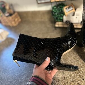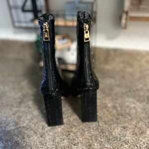 New never worn Good American Black Crocodile Patent Leather Mid Calf Booties. These have a square toe with chunky 4" block heel and back zip closure.