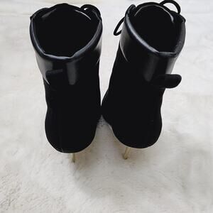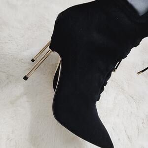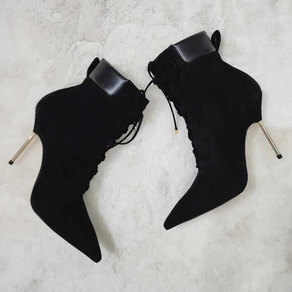 Good American Scandal Black Suede Lace Up Pointed Toe High Heel Bootie