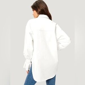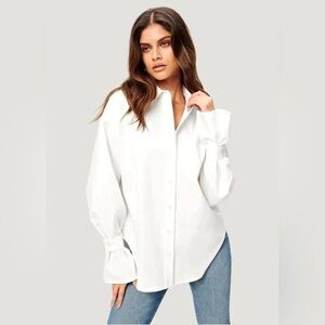 "The Tabbed Poplin Shirt from Good American is a luxurious and classic button-closure shirt that will add a touch of sophistication to any outfit. Made from a deluxe cotton blend, the Tabbed Poplin Shirt is oversized and features stylish wide sleeves with a removable belted wrist cuff. This elegant shirt will look great with any outfit, and the oversized fit will make it comfortable to wear all day long."
