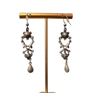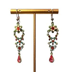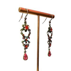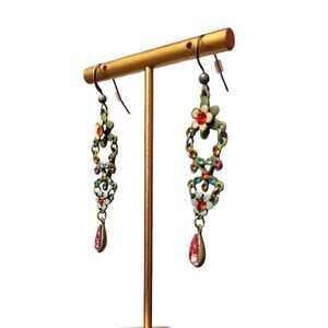 Gorgeous flower rhinestone dangle earrings. Pink, orange, and blue rhinestones with matte green and matte blue frame. 2.75” from top of earrings. These are beautiful.