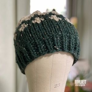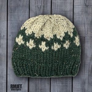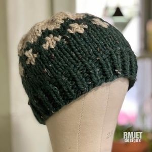 NEW Green + Oatmeal Wool Blend Handmade Knit Beanie hat Unisex Winter Hat