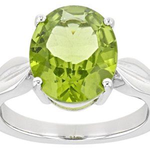 Brand New and NEVER worn Green Peridot Rhodium Over Sterling Silver Solitaire Ring 4.50ct. Measures approximately 7/16"L x 1/8"W