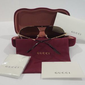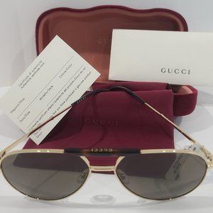 ⭐NEW Gucci GG0242S 002 Sunglasses: Complete Set (Case, Cloth, Authenticity) NEW ⭐Gucci GG0242S Aviator Sunglasses - $595.00 Color 002 Size: 59 16-145 Frame: Gold metal frames Gender: Men's ⭐Condition Brand New Gucci Sunglasses Ships in the complete case set 100% Authentic Guaranteed ⭐Your Purchase includes: - Gucci Sunglasses - Authentic Gucci Velvet Gucci case (color varies on availability) - Gucci Cleaning cloth - Matching Gucci microfiber pouch - Certificate of authenticity ⭐Details Reference: GG-0242-S - 002 Frame Color: Gold & Havana 002 Frame shape: Pilot (Aviator), full rim Temple Color: Gold Lens Color: Brown Prescription Capable: Yes Material: Gold metal 100% UV Protection, not polarized Gender: Men's Lens Width: 59 Bridge Width: 15 Arm Length: 145 ⭐NOTE #1: Unlike most Gucci sunglasses sold on the web, These all come with the GUCCI AUTHENTICITY CARD. ⭐ NOTE #2: Unreasonable offers declined without a counter - These are discounted by 50% - My price now is close to firm⭐ ⭐🤍OUR REVIEWS: Trusted Posh Ambassador with amazing 5 star reviews, click on our 'about' link or copy and paste the link into google to read our reviews. https://poshmark.com/closet/5ce359406e55d43f2a208748/love-notes